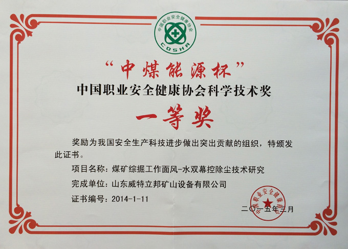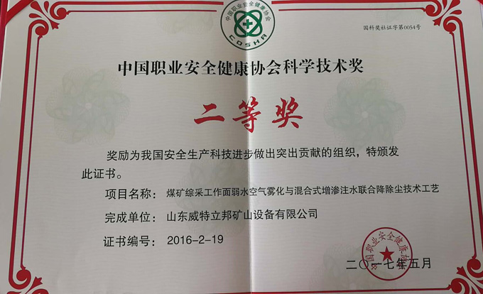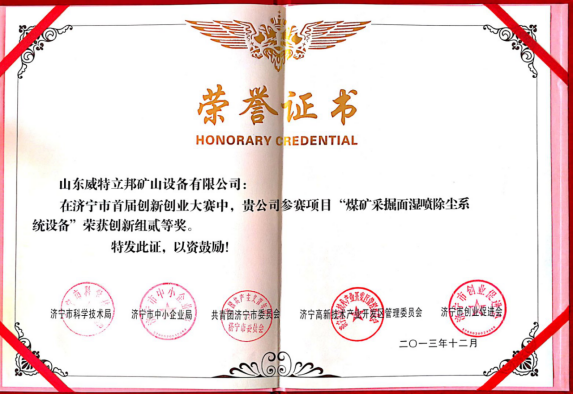 濟(jì)寧市首屆創(chuàng)新大賽“煤礦采掘面濕噴除塵系統(tǒng)設(shè)備”創(chuàng)新組二等獎